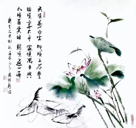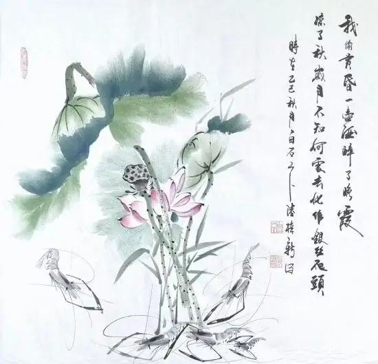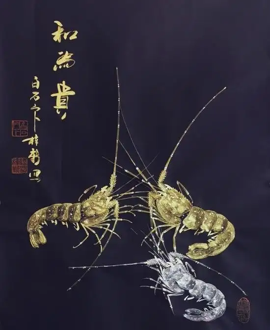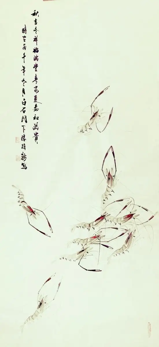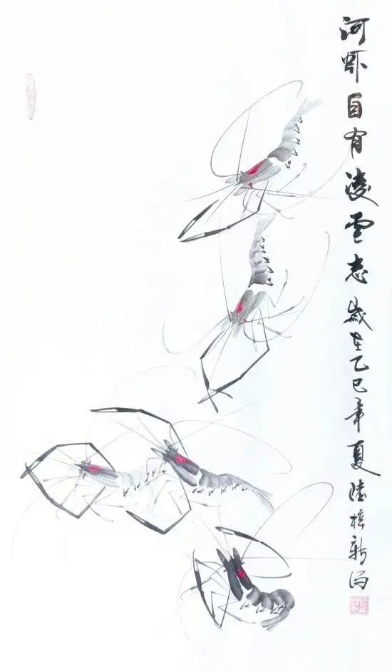 陆梓新先生的艺术之路,是一条扎根传统、守正创新的道路。作为齐派艺术的传人,他师承著名画家王广然先生,深得齐白石“妙在似与不似之间”的真谛。他笔下的虾,不再是简单的生物摹写,而是“纸上本无水,恰在水中游”的意境营造。寥寥数笔,墨色浓淡相宜,线条流畅有力,虾体透明若现,须爪灵动有神,或浮游、或腾跃,仿佛能听见水波轻漾之声。这种“形神兼备”的艺术境界,正是中国写意画“以形写神”的至高追求。而他在《风生水起》《龙行天下》等代表作中,更将虾群赋予“群策群力”“奋发向上”的时代寓意,使传统题材焕发出新的生命力。