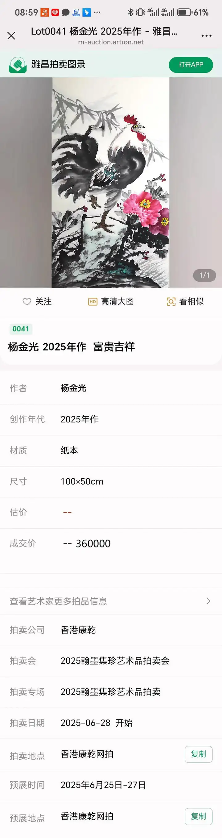 作品《富贵吉祥》以36万落槌成交