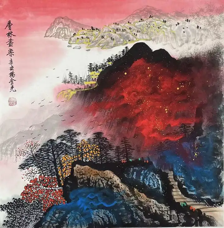 香港康乾、北京传世拍卖会上,杨金光三幅大作《迎客松》《马到成功》《中华雄魂》《富贵吉祥《泼彩四条屏》接连以260万、16万,36万、198万、88万元高价落槌,其独创的"印象派水墨"风格被联合国、国家博物馆收藏,被誉为中国最具升值潜力的十大画家之一。