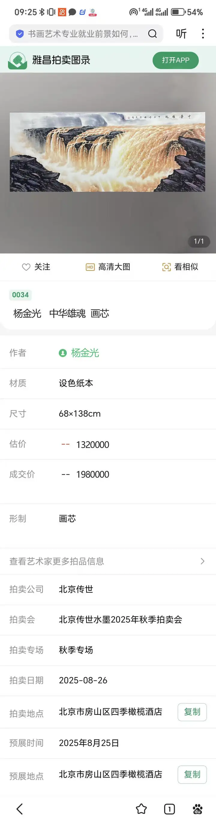 北京传世拍卖公司在2025年8月26日举行的北京传世水墨2025年秋季拍卖会中,备受关注的艺术家杨金光作品《泼彩四条屏》经场内多轮激烈竞逐,最后以88万元落槌成交,《迎客松》以260万落槌成交,其作品价值和升值空间引起社会各界专业人士瞩目。
