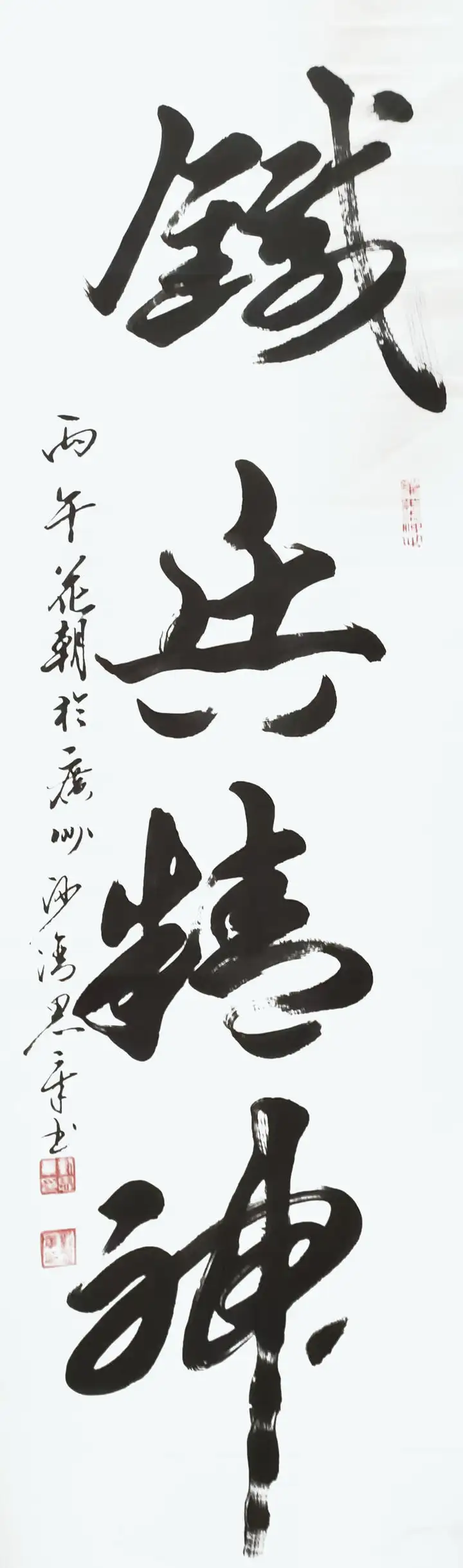 刘思章先生的《铁骨精神》四字立轴,是其军旅生涯与艺术追求的完美融合。作品以行草书写,笔力遒劲,墨色厚重,将“铁骨”的刚毅与“精神”的灵动融为一体。“铁”字起笔如刀劈斧凿,金旁刚劲有力,彰显军人的铮铮铁骨;“骨”字转折顿挫,筋骨毕现;“精”“神”二字则笔势流畅,气韵贯通,展现出坚韧不拔的意志与昂扬向上的风貌。