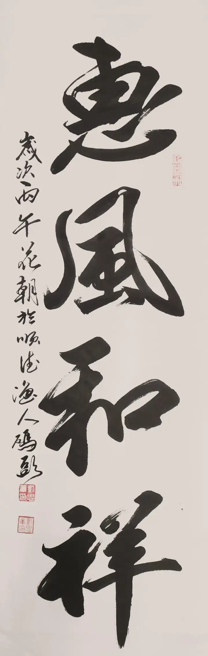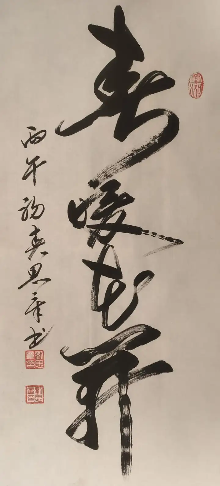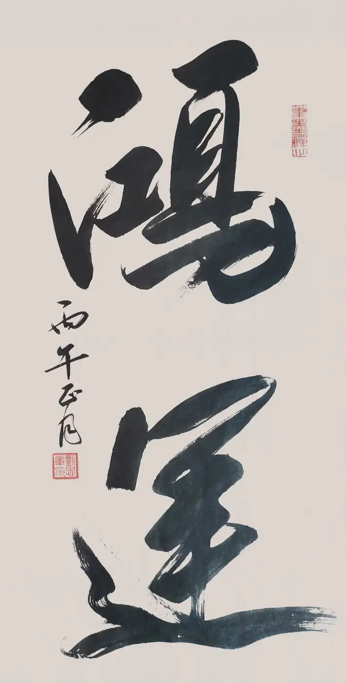 刘思章先生的《鸿运》二字,以行草立轴,墨色浓淡相生,笔力雄健奔放,尽显军人出身的刚劲与文人的洒脱。“鸿”字起笔如惊鸿掠水,点画顿挫有力,撇捺舒展如大鹏展翅,气势开张;“运”字收笔如行云流水,捺画拖锋悠长,余韵不绝。整幅作品布局疏密得当,题款“丙午正月”与朱红印章相映成趣,既见传统法度,又具时代气息。