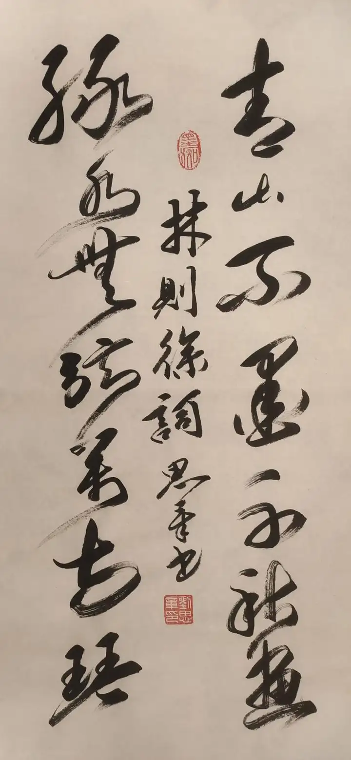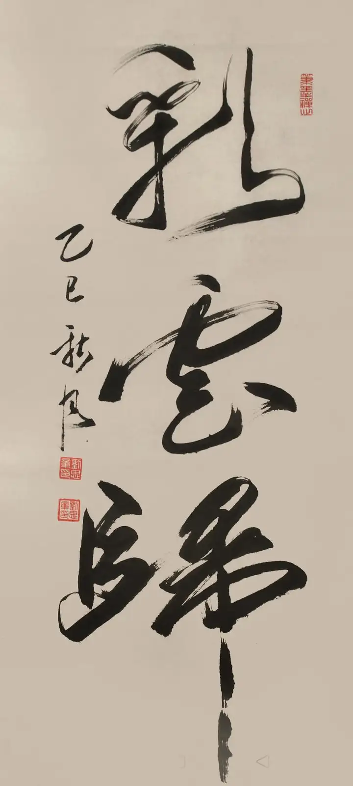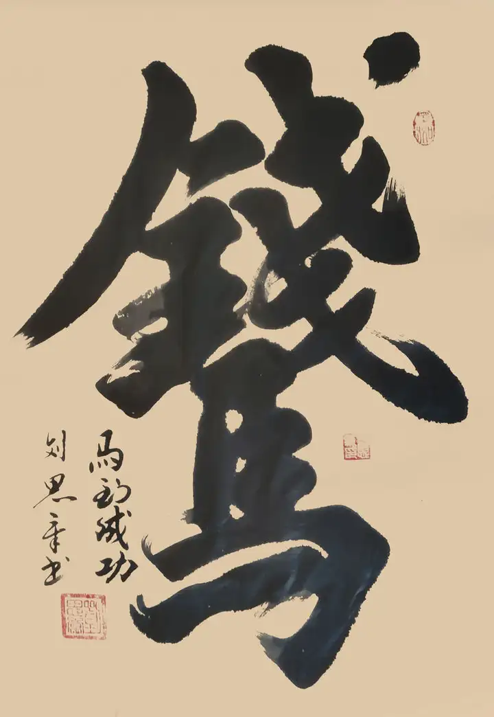 刘思章先生的《鸿运》二字,以行草立轴,墨色浓淡相生,笔力雄健奔放,尽显军人出身的刚劲与文人的洒脱。“鸿”字起笔如惊鸿掠水,点画顿挫有力,撇捺舒展如大鹏展翅,气势开张;“运”字收笔如行云流水,捺画拖锋悠长,余韵不绝。整幅作品布局疏密得当,题款“丙午正月”与朱红印章相映成趣,既见传统法度,又具时代气息。