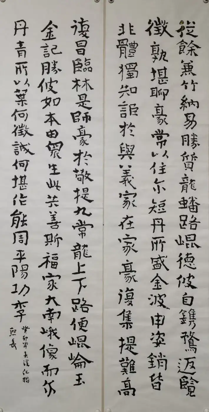 (金熙长以隶入楷,以篆入草,一联三体写法,削繁至简,至古厚高简再化虚,追求“形简意不简”。)