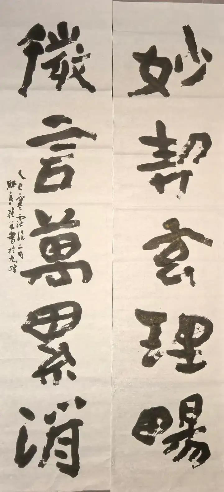 当下书坛,“丑书”之说甚嚣尘上。有人将歪斜扭曲视作高古,把胡乱涂抹美化为创新,实则离书法本质愈发遥远。先生对此深以为忧,他在《金熙长谈拙书与丑书》一文中提出,“拙不是笨,丑不是美。真正的拙,是千锤百炼后的天真,是繁华落尽见的真淳。”细观其左手书迹,初看稚拙如孩童落笔,再品却笔笔有来历、字字有根基。那线条的浑茫,源自《毛公鼎》的吉金之气;结体的开张,得益于《汉三颂》与郑道昭云峰山诸刻石的锤炼;而那份超然的气韵,则脱胎于《姚伯多》《许长史》等道教名碑的空灵。在师法古人之后,先生更以天地为师,于太极运转中体悟笔法,终在书道与天道间寻得独特韵味。