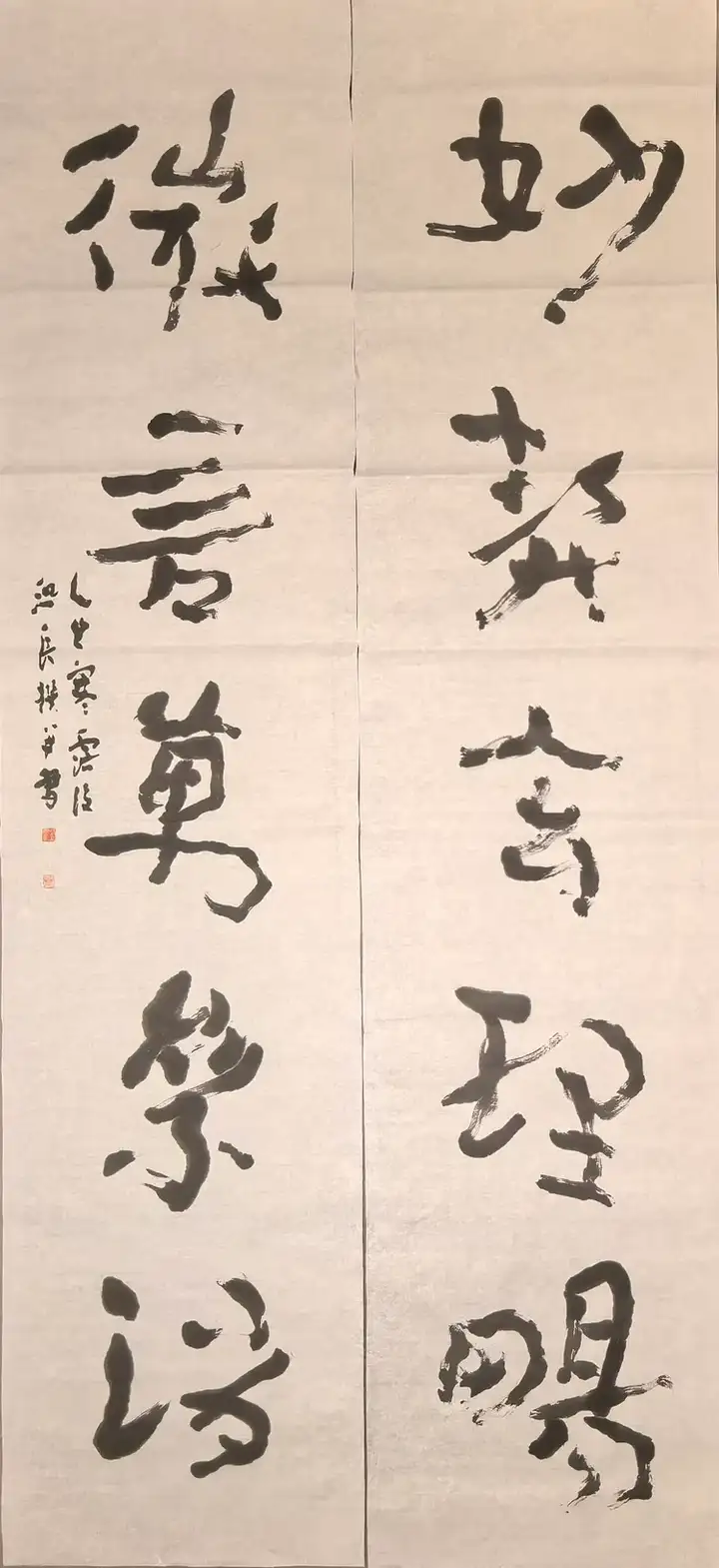 他将道家自然思想融入笔墨实践,撰写《天工化笔》一文,深刻阐释“书道即天道”的艺术理念。在先生眼中,毛笔绝非单纯的书写工具,而是连通天人的媒介——笔锋起落如阴阳消长,墨色浓淡似虚实相生,线条流转若四季更迭。书斋中悬挂的自作诗恰是心境写照:“空谷传虚籁,鸿蒙启砚田。左书通篆籀,元气满云笺。”这“篆籀”二字,正是先生书法的根基所在。他常言“篆籀者,文字之祖,笔法之母”,其线条圆厚内敛,劲健如地脉奔涌,朴厚若山岳自持,恰是天地造化的轨迹显化于笔墨。先生从《毛公鼎》等吉金文字中悟出“吉金图符化音符在历代碑帖中的投射说”,认为上古铭文实为承载宇宙能量的“道纹”,运篆籀笔法,便是以身为媒,引动天地间的浩然元气。